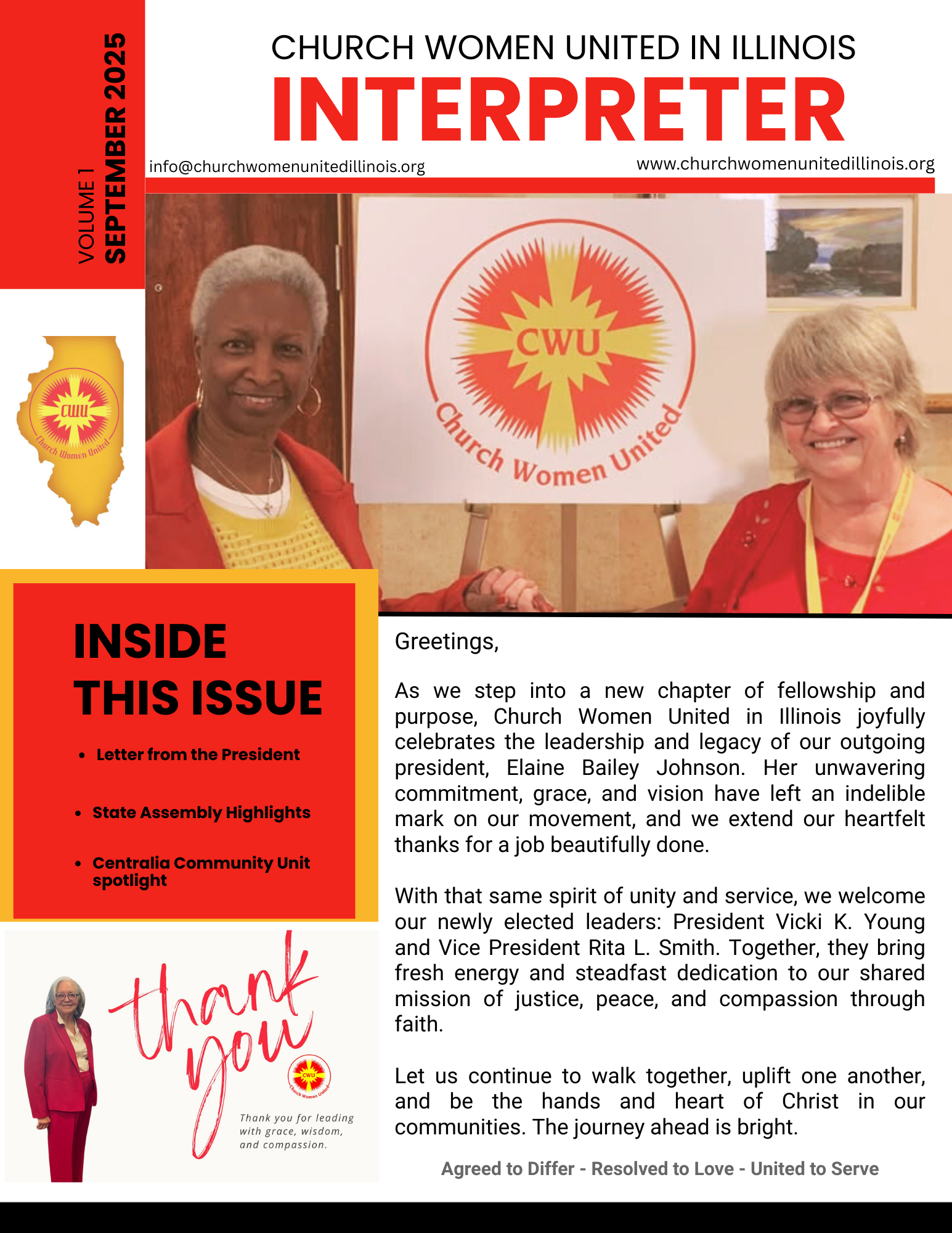 Church Women United in Illinois (CWUIL) Interpreter is the newsletter of the state chapter of the national organization, Church Women United (CWU). Founded in 1941, CWU is an ecumenical movement of interdenominational Christian women from diverse racial, ethnic, age, and economic backgrounds. The organization aims to bring together Christian women, united in their faith, to work towards the betterment of the community and the development of women’s full potential in society.