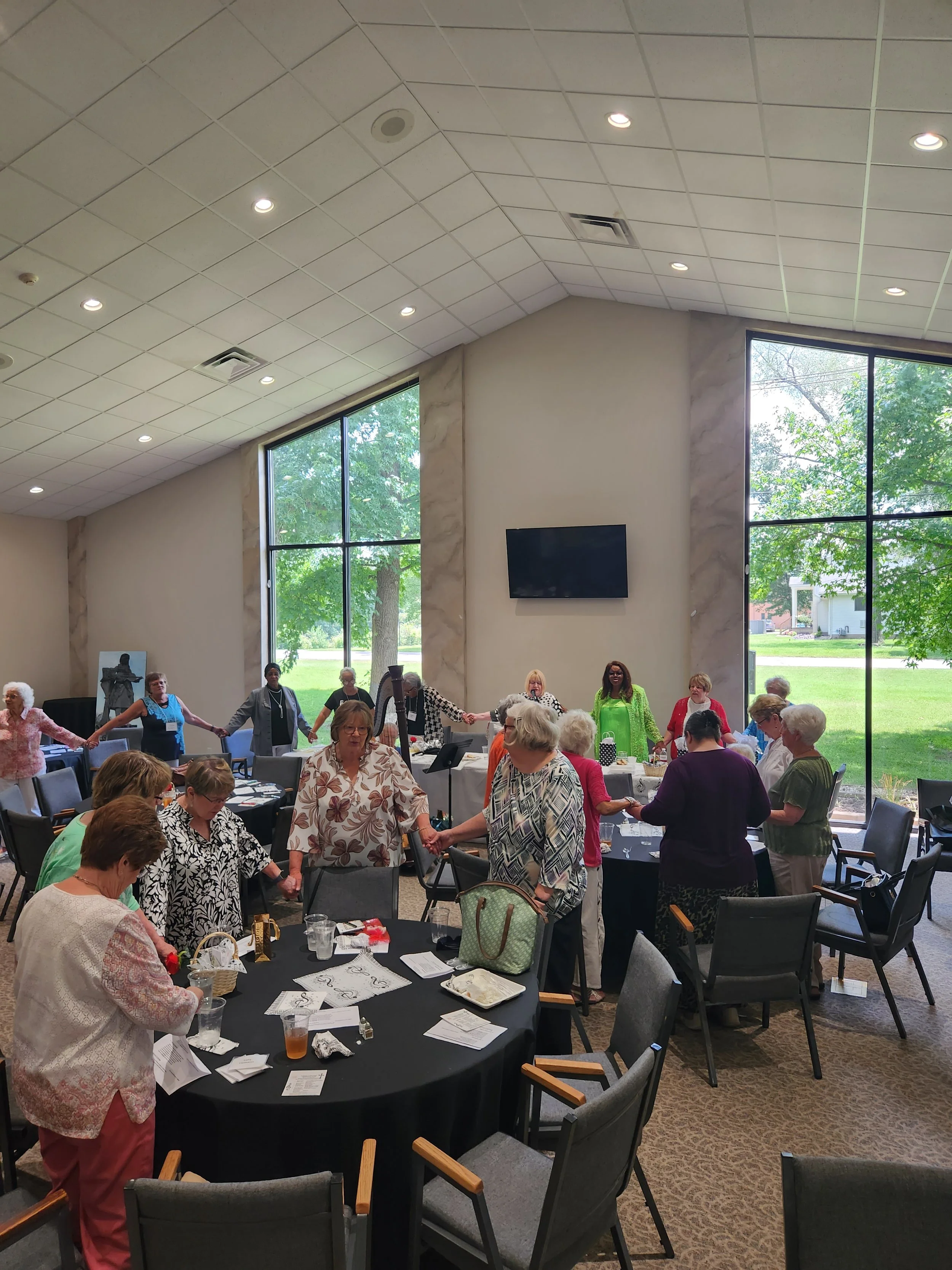 The gallery of the Centralia Community Arts Center was the site for the local unit’s special luncheon on Thursday, June 26, 2025. Sixty ladies were in attendance (20 more had registered but were unable to attend for various reasons). The theme was “A Basket of Blessings” which was featured at each table with a music-lined basket accented with a red silk rose. The attendees were encouraged to write personal blessings on paper and add to the baskets. About ½ were read aloud after the meal. All written contributions will be listed and distributed at the next business meeting on September 25 th being hosted by 1st United Methodist Church women.
